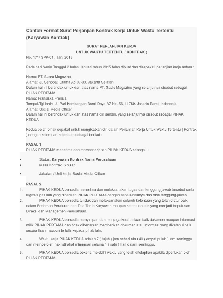 Doc Surat Perjanjian Kerja Untuk Waktu Tertentu Saraja Setjo Academia Edu from 0.academia-photos.com We did not find results for: Maybe you would like to learn more about one of these? Check spelling or type a new query.